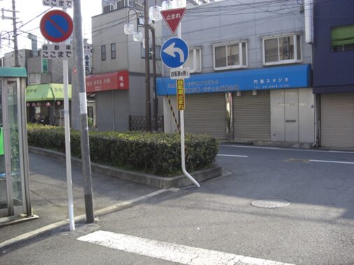 枝切(小阪)街道との交差点枝切街道は左から来て左に折れ少しの間街道は重なる