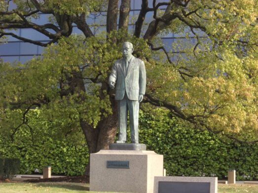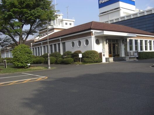 左に松下幸之助歴史館の建物その前に松下幸之助の銅像