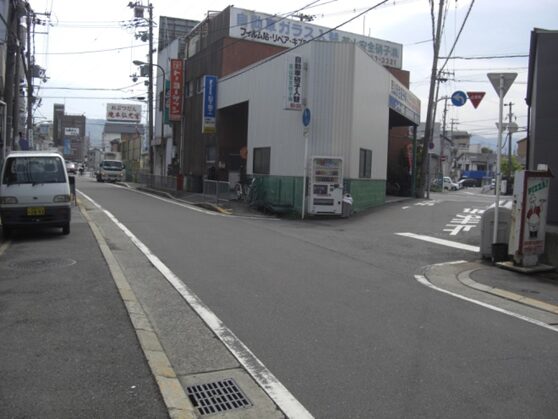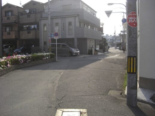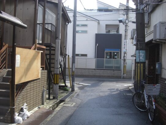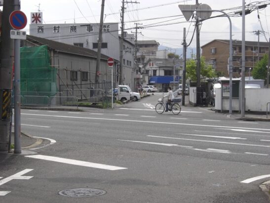 右手斜め前に京阪西三荘駅、その手前の交差点を左に折れる