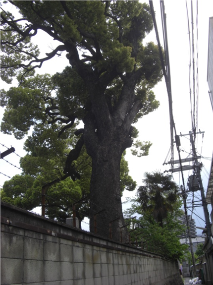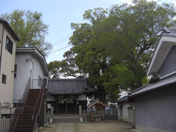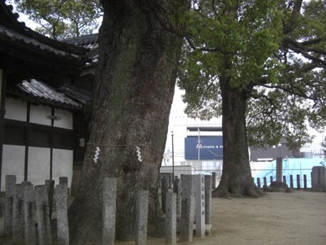本殿を囲んで神木の巨木 本殿に向かって右奥に樹齢250年のクスの木、その手前の石で囲いしたクスの木は樹齢500年、更にその手前に樹齢250年のムクの木、本殿左側に樹齢250年の銀杏の木、と大木が神社の重みを増している。