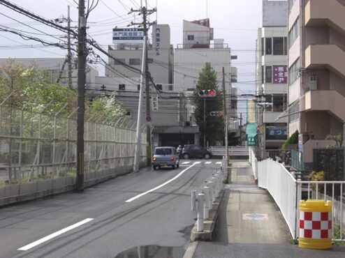 その先細い道を進むと広い道の信号にでるので左に折れる