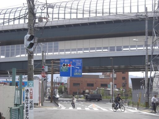 高架の直ぐ先で、京阪電車に沿ってきた158号の道が右から合流する。中央環状を抜けた右が京阪門真市駅、暫く右に京阪に沿って進む