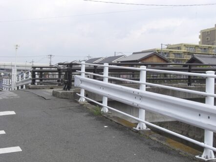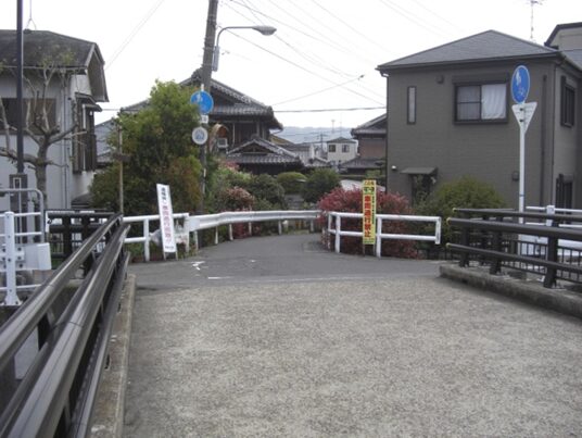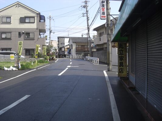 街道は橋を渡り直ぐの交差点で左に折れる(向こうから進んできた)。重複してき枝切街道は、川の手前で右に折れて分かれる