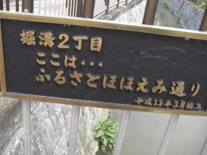 街道に戻り辻から街道の堀溝の街並みを見る。左下が自然石の道標
