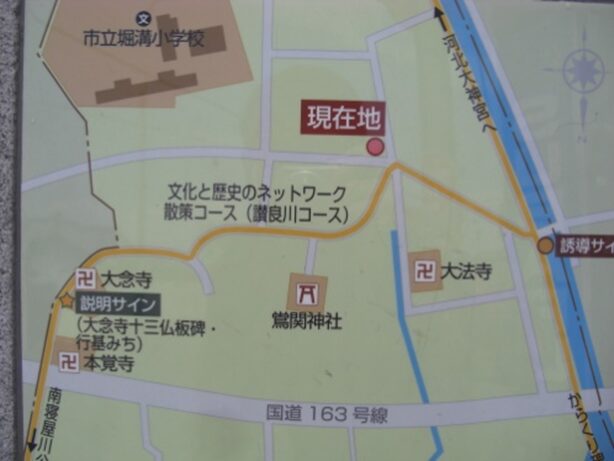 直ぐ先163号の広い道で車多く横断危険なので50m程左に迂回し信号を渡り、国道向こう側の街道に入る