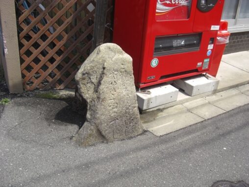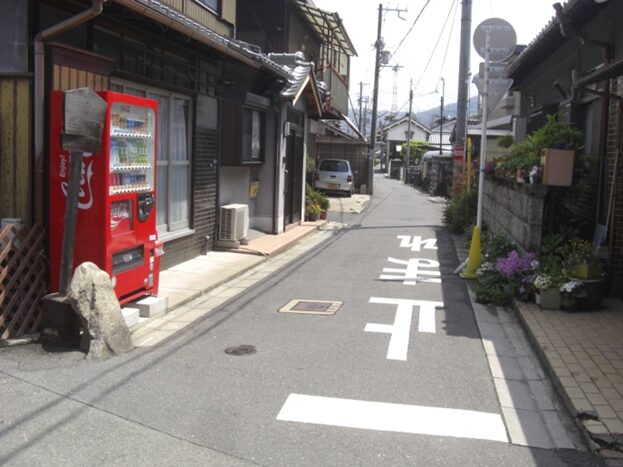 その先の辻で真っ直ぐ進めば国道に直ぐ出るが街道は右に折れる。その左、角と右に折れる自販機の横に
