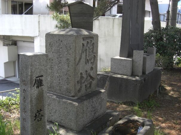 直ぐのところ右手に四条畷消防署の先隣りに 雁塔 雁の夫婦の情愛の深さをた称得たもの