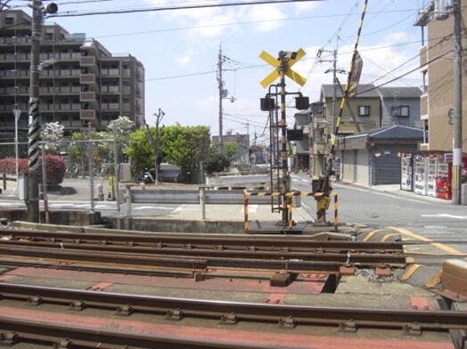 難宗寺裏のT字路にもどり右に折れて進むと、京阪電車に突き当たるので左に折れる