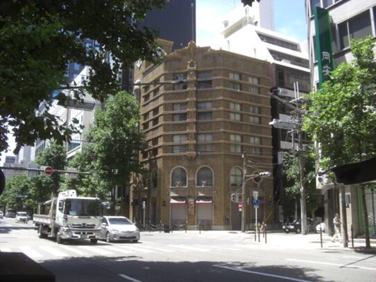 西南角に生駒ビルジング昭和5年、生駒時計店(明治3年創業)が建つ。石像の鷲の彫刻が印象的。