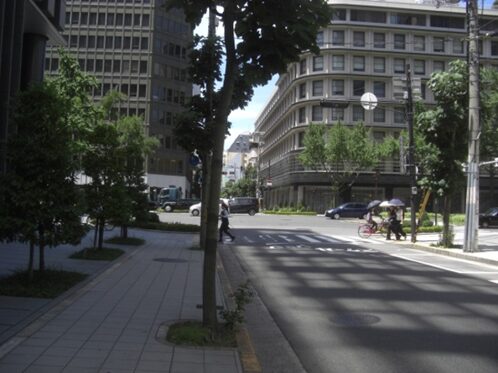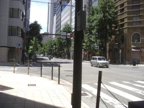 御堂筋交差点向かい右角は大阪ガスビル、左角日鉄御堂筋ビル