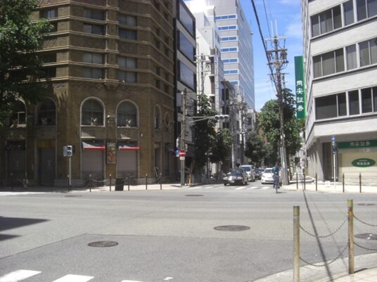 平野町通りを振り返る。向かい左角御堂筋野村ビル、右角中国銀行