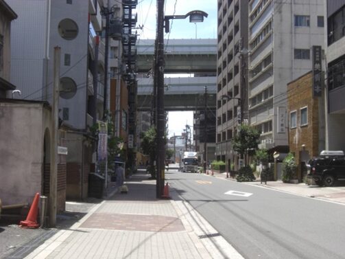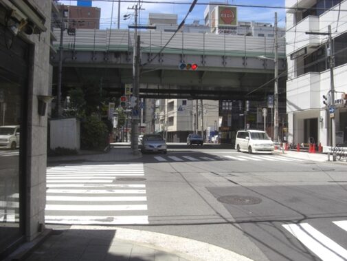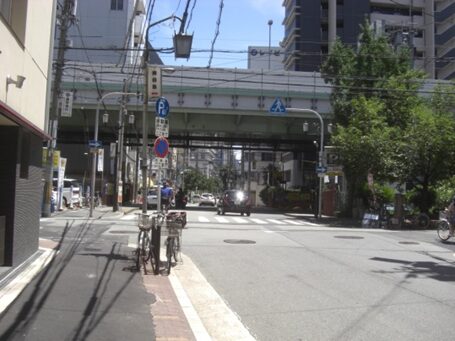 高架と平野町を振り返る、高架を超えると京町堀通りに入る大阪城築城時伏見京町から移ってきた町人らによって開削された