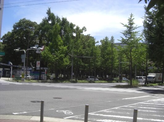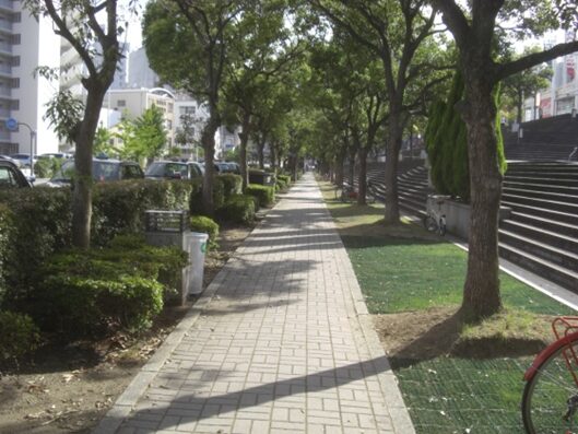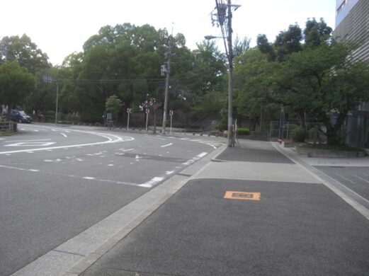 京町堀1西交差点で公園は広い道のなにわ筋に分断される