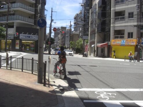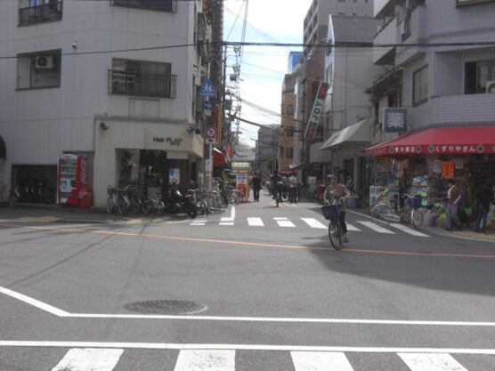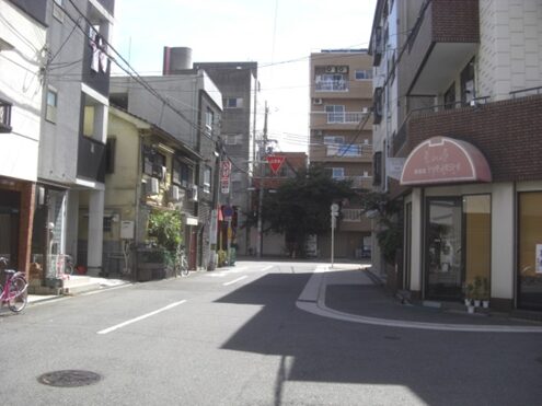 交差点に戻り、左に、みなと生協診療所の道を真っ直ぐ進む