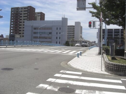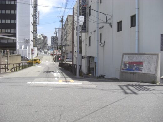 突き当たりから振り返る。東南の角に 安治川橋の碑と説明版 がある
