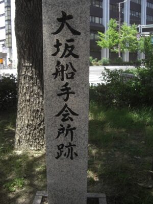 大阪船手は、大阪湾から木津川・淀川への船舶の出入りを管理・掌握することお、大阪湾に停泊している船舶を掌握することを職務とする江戸幕府の役職で、1620年に設立された。その中心施設がこの地に於かれた。(大阪市教育委員会の説明版)