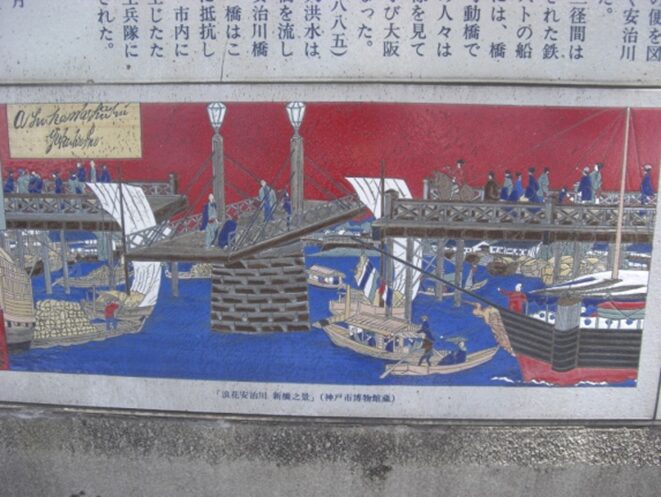 明治18年(1885)大阪を襲った大洪水は多くの大川の橋を流し、流木となって安治川橋に押し寄せた。橋はこの流木や洪水に抵抗しよく耐えたが、市内に洪水の恐れが生じたため、やむなく工兵隊により爆破撤去された。                                                        (説明版より)