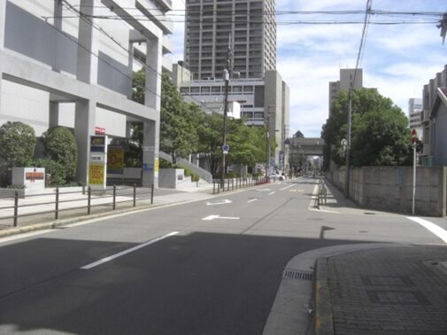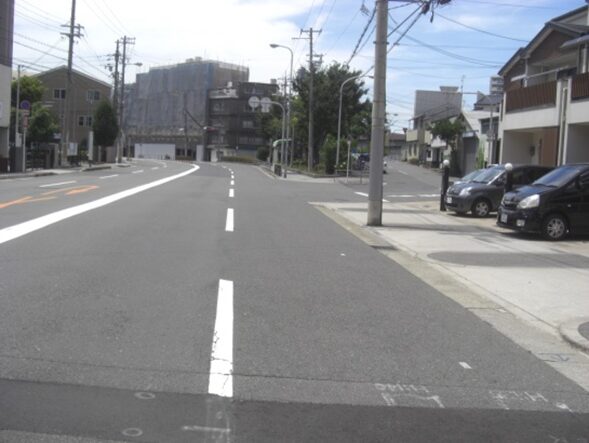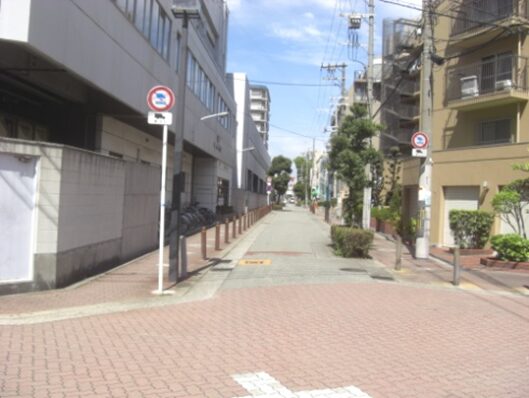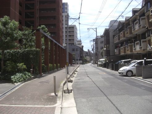 マンションを左右に見て