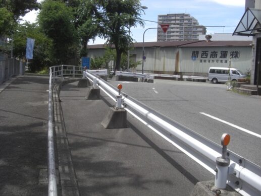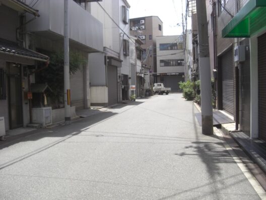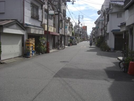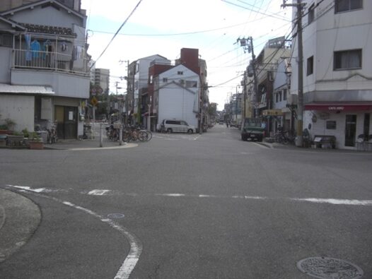 い道を200mほど進んだところの二股広い道は左にカーブしていくが、旧道は右に、広い道の北側、安治川との間を沿って進む
