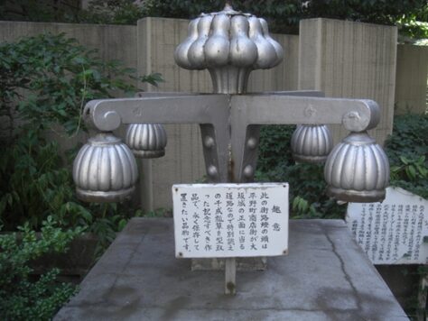高架の下に、此の街路灯の頭は平野町商店街が大阪城の正面に当たる道路なので特別誂え、千成秒譚を型取った記念すべき作品。