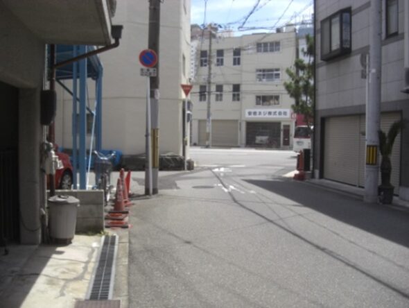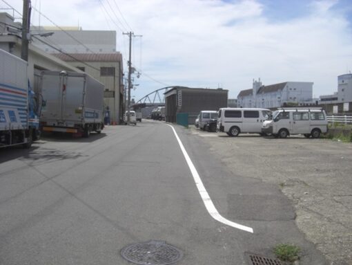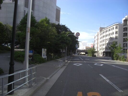 元の築港東交差点に戻り右に折れ、みなと通りを渡りを渡った先の道。運河は右手になる