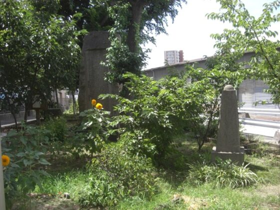 左の角の木の茂った中に 古川跡の碑 大阪府の防潮堤工事にともない昭和27年11月この地点から東、安治川に至る長さ750m、幅15mの古川を埋め立てた跡碑