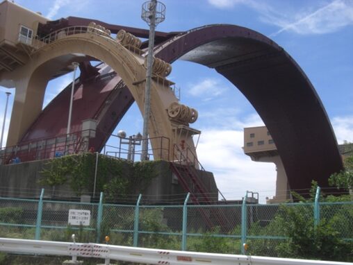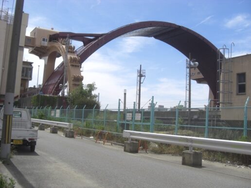 高架を潜ると目の前に大きな 安治川水門 高潮被害を防ぐためのアーチ型としては日本で最初の防潮堤。アーチ型の主水門を閉めるのに30分かかる
