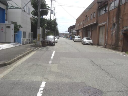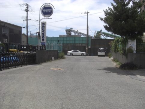 正面の春日商事の前を左斜めに折れすぐの広い道を右へ