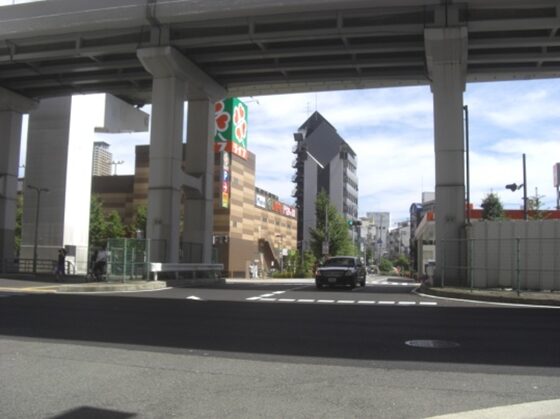 国道43号線の高架を潜る