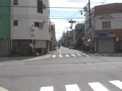 右に曲がるところの交差点、丸島金物店の前の道を西へ