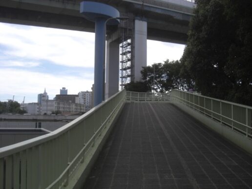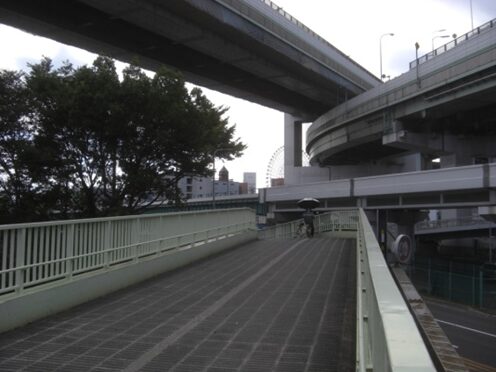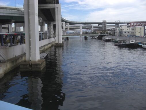 複雑な阪神高速4号湾岸線の天保山JCT高架したの、天保山運河に架かる千舟橋の高架橋を渡る