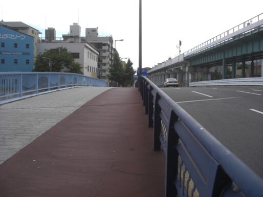 そのすぐ先の阪神高速(環状線)の高架を潜る。この下はかつての西横堀川の京町橋。1600年開削された土佐堀川と道頓堀川を繋いでいた堀川。昭和46年阪神高速環状線の建設のため埋め立てられた