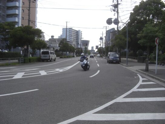 交差点を超えて、左にホテル大阪ベイタワー、NTTコムウエア弁天ビル、クロスタワー大阪ベイ等の高層ビルを見ながら進む。