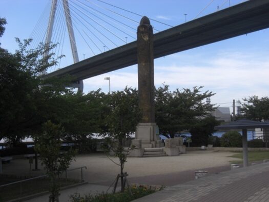 天保山の北東に架かる、阪神高速4号湾岸線と 明治天皇艦観之碑 ここが天保山