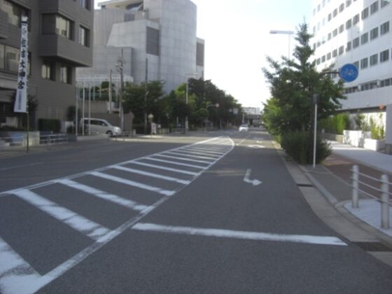 左のハイツ天保山の横を100mほど進み、みなと通りの広い道に合流(港晴2交差点)、ここを左に折れる
