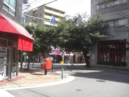 更に真っ直ぐ進むと、五差路に出る。街道は真っ直ぐ進む。ここで、左鋭角の細いみちを200mほど入ると、突当りが市営池島住宅34号棟。その南側に、湊屋住吉神社がある