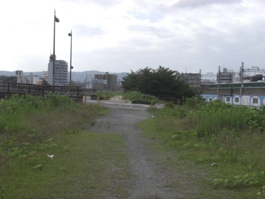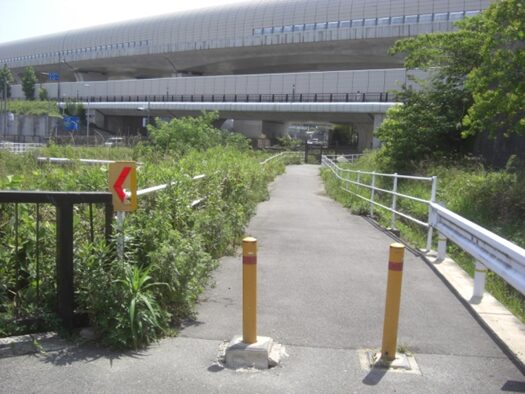 右に折れて堤防の下を進み、すぐの京阪本線の高架を潜る