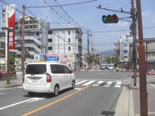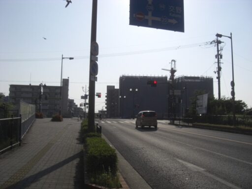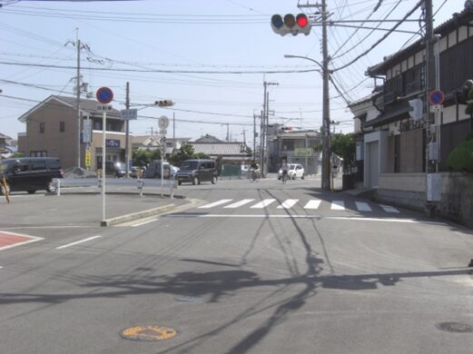 左の枚方警察署を見て交差点を進む