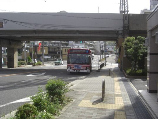 小川を渡った辻から、250mほど進むと、やがて南皮膚科医院が右手角にあり道は突当る。10mほど右に折れてすぐまた左(東)に折れて150mほど進むと、左からバス道路が合流してくるので、バス道を左に分け右に入る、左角に飯田書店があり20mほどで、、小川の所で分岐した道と合流する。