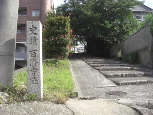 宮之阪3の交差点を過ぎ百済坂を上る、その途中左の石段を上るところ入口に 百済寺址の碑