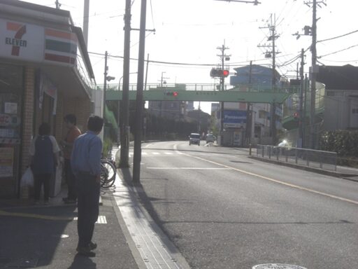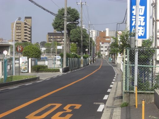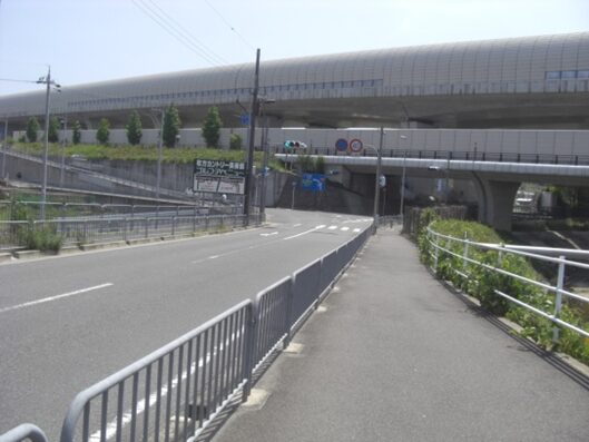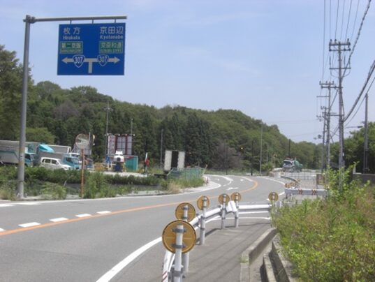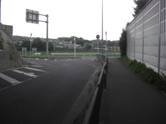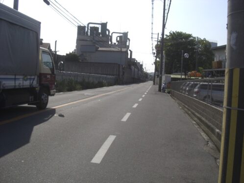中宮病院東交差点を越えて、歩道橋の交差点に出たところで、道が三本に分岐しているので、真中の道を進む
