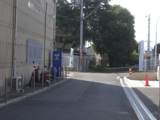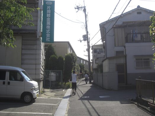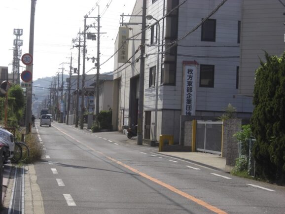 信号を越えた先、春日野二丁目で右の旧道に入る、少し解りにくいが枚方東部企業団地の看板がビルの壁に立つ