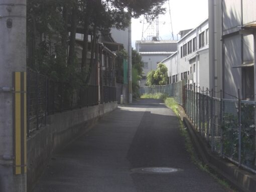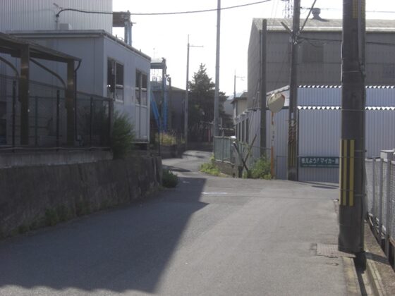 突当りを左に折れて、工場の間の狭い道を進む春日野二丁目2の表示