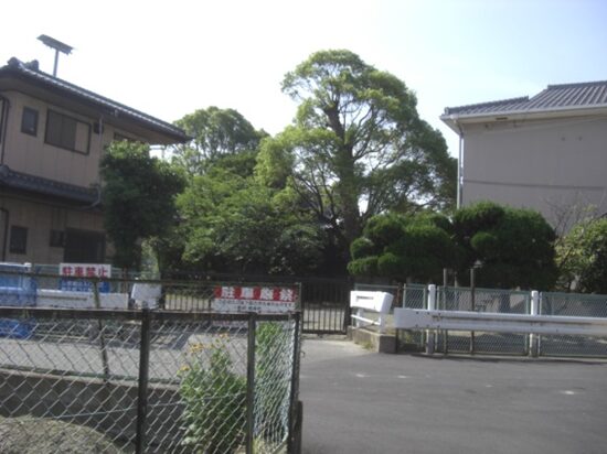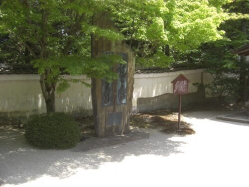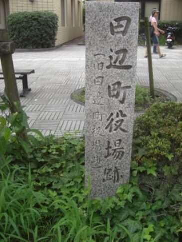 左に市立中央図書館がありその前に 旧田辺町役場跡の碑