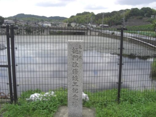 尼ヶ池の東側の堤に、尼ヶ池樋門改修竣工記念碑