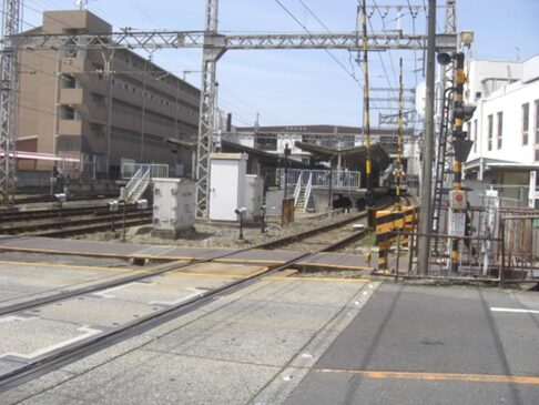 JR線の踏切を越える