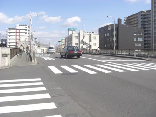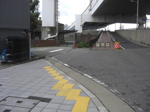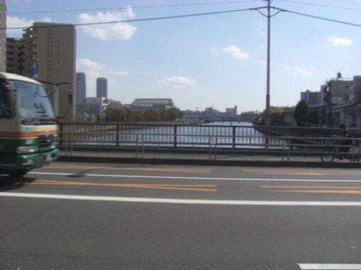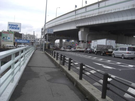 広い道路と車が多く、横断歩道がなく危険で渡れない。おそらく人が横断する道路と考えていないだろう。やむなく真っ直ぐ坂を下り、200mほど先の佃6丁目交差点を右に渡り、左門殿川の所に戻るしかない。