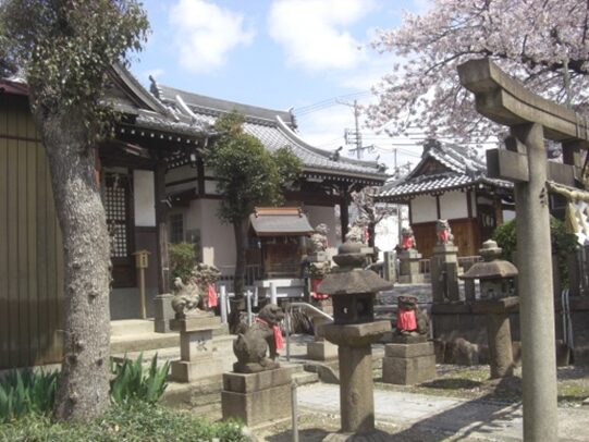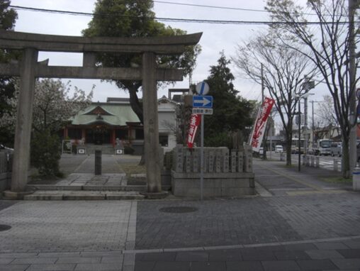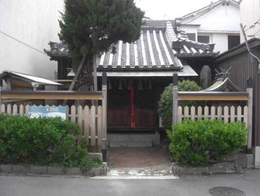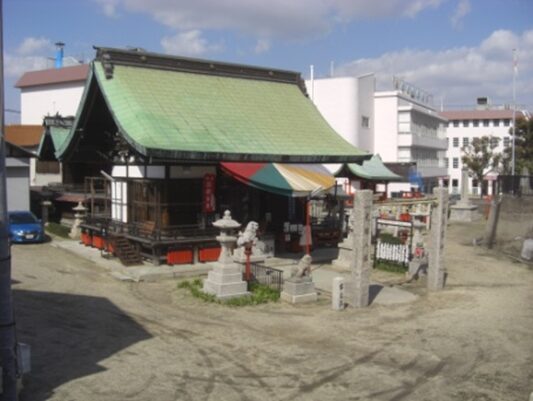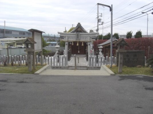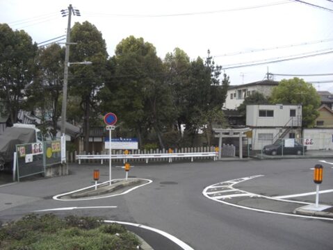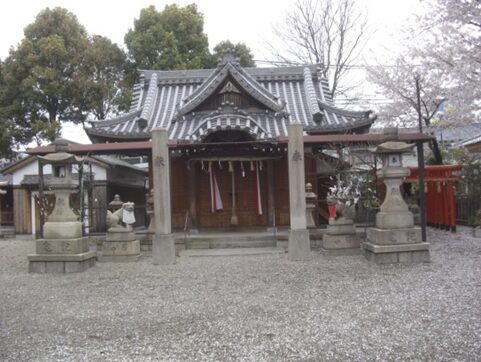 中島大橋を渡ったところの中島大橋信号交差点を神崎川を右に見て50mほど進み、信号の所を左に折れたところにあるのが 五社神社