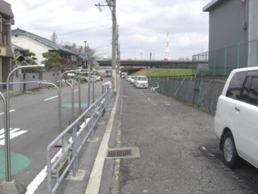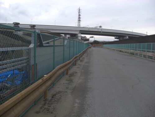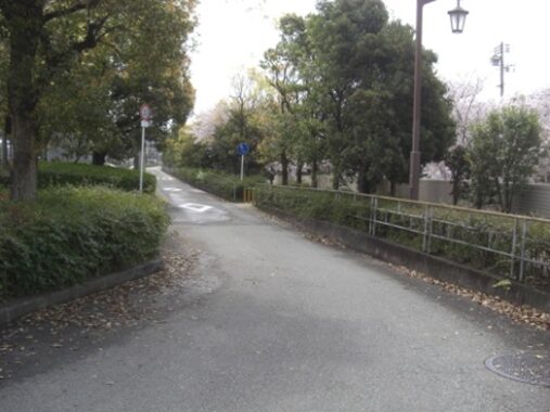 ここで終わり、元に戻る堤防途中で分岐があり、前述の大野緑地道を左に進み堤防より左斜めに進みます、国道43号線と大野交差点のところまで戻り