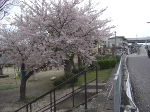 堤防右手下の、中島1丁目の公園内の満開の桜が綺麗